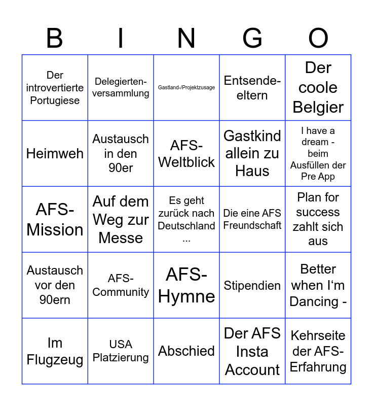 This bingo card has 25 words: AFS-Community, Abschied, AFS-Weltblick, Im Flugzeug, Der coole Belgier, Der introvertierte Portugiese, Heimweh, Delegierten-versammlung, Die eine AFS Freundschaft, AFS-Hymne, Gastkind allein zu Haus, AFS-Mission, Stipendien, Better when I‘m Dancing -, Austausch in den 90er, Kehrseite der AFS-Erfahrung, Plan for success zahlt sich aus, Gastland-/Projektzusage, I have a dream - beim Ausfüllen der Pre App, Auf dem Weg zur Messe, Es geht zurück nach Deutschland ..., USA Platzierung, Austausch vor den 90ern, Entsende-eltern and Der AFS Insta Account.
