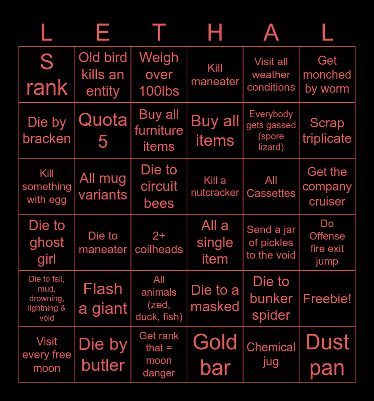 This bingo card has 60 words: Zed dog!!, All a single item, A rank, Kill a nutcracker, Do Offense fire exit jump, B rank adamance without breaking bridge, Die by bracken, obtain 100+ value beehive, Buy all furniture items, Die to jester, Kill maneater, make profit from opening gift box, Get monched by worm, Visit every free moon, Die to eyeless dog, S rank, Kill something with egg, Visit all weather conditions, Make the facility chasm jump thing, Quota 5, All mug variants, Weigh over 100lbs, 2+ coilheads, Die to maneater, Die to a landmine, Die by butler, Die to bunker spider, All egg variants, Buy all items, Gold bar, Cash register, Bring maneater outside (and survive), Kill thumper, Steal from the hoarding bugs nest, Old bird kills an entity, Flash a giant, Kill a teammate with every weapon, Scrap triplicate, Get rank that = moon danger, Everybody gets gassed (spore lizard), Quota 3 deathless, All Cassettes, Die to circuit bees, Die to the barber, Die to ghost girl, Die to a masked, Die to hygrodere, Die to Baboon hawk, Have comedy and tragedy, Get the company cruiser, Send a jar of pickles to the void, Die to Jeb, Dust pan, All animals (zed, duck, fish), Freebie!, Chemical jug, only Visit Dine for a quota, Only visit Experimentation for a quota, Die to fall, mud, drowning, lightning & void and Kill a snare flea.