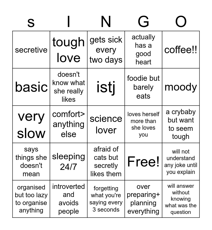 This bingo card has 25 words: sleeping 24/7, forgetting what you're saying every 3 seconds, istj, organised but too lazy to organise anything, coffee!!, secretive, basic, tough love, loves herself more than she loves you, afraid of cats but secretly likes them, foodie but barely eats, very slow, Free!, will not understand any joke until you explain, doesn't know what she really likes, will answer without knowing what was the question, a crybaby but want to seem tough, gets sick every two days, moody, comfort> anything else, science lover, introverted and avoids people, says things she doesn't mean, actually has a good heart and over preparing+ planning everything.