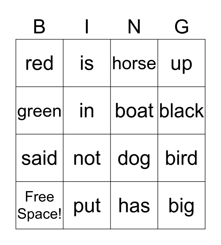 This bingo card has a free space and 15 words: Free Space!, big, horse, red, black, green, not, has, in, said, bird, up, boat, is and put.