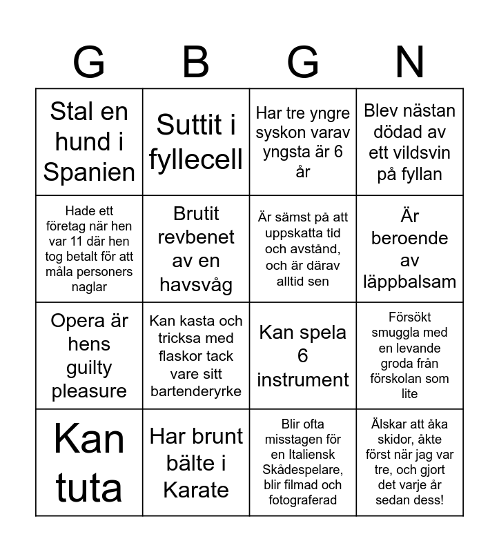 This bingo card has 16 words: Har brunt bälte i Karate, Försökt smuggla med en levande groda från förskolan som lite, Har tre yngre syskon varav yngsta är 6 år, Stal en hund i Spanien, Opera är hens guilty pleasure, Suttit i fyllecell, Kan spela 6 instrument, Blir ofta misstagen för en Italiensk Skådespelare, blir filmad och fotograferad, Hade ett företag när hen var 11 där hen tog betalt för att måla personers naglar, Brutit revbenet av en havsvåg, Kan tuta, Blev nästan dödad av ett vildsvin på fyllan, Kan kasta och tricksa med flaskor tack vare sitt bartenderyrke, Är beroende av läppbalsam, Är sämst på att uppskatta tid och avstånd, och är därav alltid sen and Älskar att åka skidor, åkte först när jag var tre, och gjort det varje år sedan dess!.