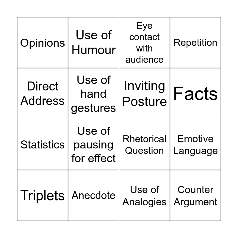 This bingo card has 16 words: Anecdote, Emotive Language, Eye contact with audience, Opinions, Statistics, Use of Humour, Rhetorical Question, Use of Analogies, Direct Address, Use of hand gestures, Triplets, Repetition, Use of pausing for effect, Facts, Inviting Posture and Counter Argument.