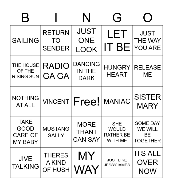 This bingo card has a free space and 44 words: IM TOO SEXY, ITS ALL OVER NOW, ITS IN HIS KISS, JIVE TALKING, JOHNNY BE GOOD, JUST LIKE JESSYJAMES, JUST ONE LOOK, IMAGINE, JUST THE WAY YOU ARE, THERES A KIND OF HUSH, LET IT BE, MANIAC, MORE THAN I CAN SAY, MUSTANG SALLY, MY IRISH MOLLY, MY WAY, NEVER CAN SAY GOODBYE, NOTHING AT ALL, RELAX, RELEASE ME, RETURN TO SENDER, ROSE GARDEN, SAD SONGS, SAILING, SAY A LITTLE PRAYER, SISTER MARY, TAKE A CHANCE ON ME, TEARS IN HEAVEN, SHE WOULD RATHER BE WITH ME, TAKE GOOD CARE OF MY BABY, TEENAGER IN LOVE, SOME DAY WE WILL BE TOGETHER, SIMPLY THE BEST, YOUR SIXTEEN, VINCENT, WOMAN, AMERICAN PIE, BUT I DO, DANCING IN THE DARK, THE HOUSE OF THE RISING SUN, HUNGRY HEART, ILL TELL ME MA, RADIO GA GA and LET YOUR LOVE FLOW.