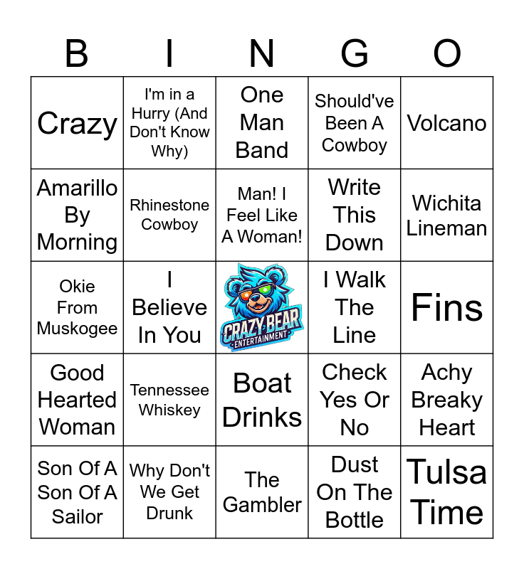 This bingo card has a free space and 50 words: When the Sun Goes Down, Tulsa Time, Islands in the Stream, The Gambler, Tennessee Whiskey, Southern Nights, I'm in a Hurry (And Don't Know Why), Cheeseburger In Paradise, Amarillo By Morning, Drinkin' Problem, Rhinestone Cowboy, Should've Been A Cowboy, Achy Breaky Heart, Check Yes Or No, Come Monday, Coward Of The County, Man! I Feel Like A Woman!, I Walk The Line, Carrying Your Love With Me, Volcano, I Believe In You, Dust On The Bottle, Crazy, Write This Down, Changes In Latitudes, Changes In Attitudes, Highwayman, Wichita Lineman, I Don't Need Your Rockin' Chair, One Man Band, Boat Drinks, Hey, Good Lookin', Tight Fittin' Jeans, Two Dozen Roses, Alright, Why Don't We Get Drunk, Body Like A Back Road, Louisiana Woman, Mississippi Man, Song of the South, Mammas Don't Let Your Babies Grow up to Be Cowboys, Fins, Love Somebody, Knee Deep, Dixieland Delight, It's 5 O'Clock Somewhere, Son Of A Son Of A Sailor, Okie From Muskogee, Delta Dawn, Folsom Prison Blues, Good Hearted Woman and A Pirate Looks At Forty.