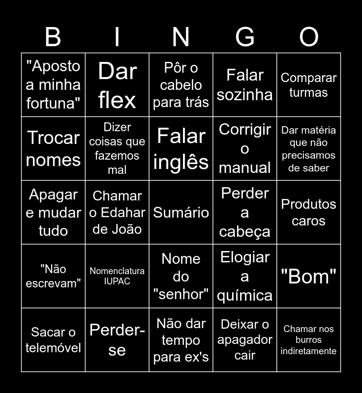 This bingo card has a free space and 33 words: Usar a mão, "Beatriz", Chamar o Edahar de João, "Okay", "Não escrevam", Dizer coisas que fazemos mal, Comparar turmas, Sacar o telemóvel, Dar flex, Falar da família, Falar inglês, Pôr o cabelo para trás, Risinho, Valentim + stora, Perder a cabeça, Dar matéria que não precisamos de saber, Perder-se, Apagar e mudar tudo, Nomenclatura IUPAC, Elogiar a química, Nome do "senhor", Fazer algo errado, "Aposto a minha fortuna", Produtos caros, Não dar tempo para ex's, Chamar nos burros indiretamente, Falar sozinha, Corrigir o manual, Trocar nomes, "Bom", "Muito bem", Deixar o apagador cair and Chatear-se com a disposição da sala.