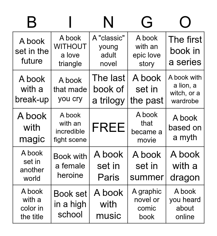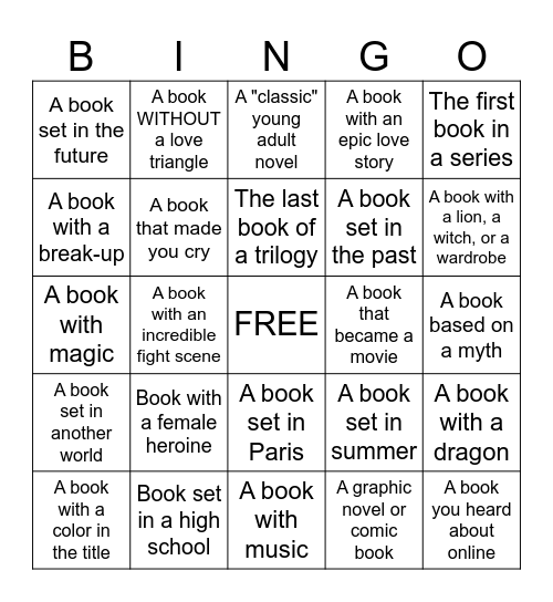 This bingo card has a free space and 24 words: Book with a female heroine, Book set in a high school, The last book of a trilogy, A book with a color in the title, The first book in a series, A book set in the future, A book with a break-up, A book WITHOUT a love triangle, A book that became a movie, A book set in Paris, A book set in the past, A book with magic, A book set in summer, A book with a dragon, A book that made you cry, A graphic novel or comic book, A book based on a myth, A "classic" young adult novel, A book with a lion, a witch, or a wardrobe, A book with an incredible fight scene, A book you heard about online, A book set in another world, A book with an epic love story and A book with music.