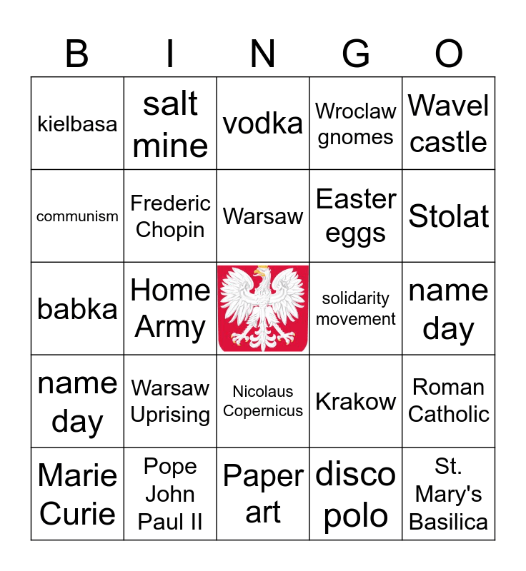 This bingo card has a free space and 24 words: Warsaw Uprising, Pope John Paul II, Warsaw, Marie Curie, Wavel castle, kielbasa, communism, salt mine, solidarity movement, Nicolaus Copernicus, Easter eggs, babka, Krakow, Roman Catholic, Frederic Chopin, disco polo, name day, vodka, Stolat, Home Army, St. Mary's Basilica, name day, Wroclaw gnomes and Paper art.