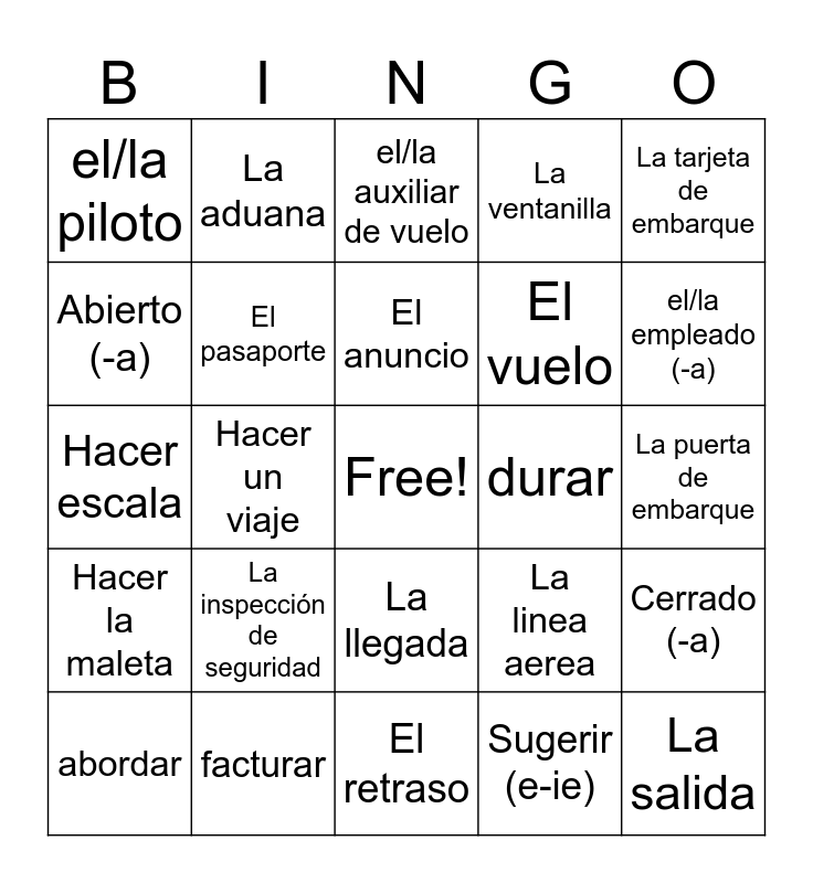 This bingo card has a free space and 33 words: El equipaje, Extranjero (-a), Hacer un viaje, La maleta, Hacer la maleta, El pasaporte, La tarjeta de embarque, abordar, La aduana, El aeropuerto, El anuncio, el/la auxiliar de vuelo, Con destino a, De ida y vuelta, durar, el/la empleado (-a), facturar, Hacer escala, La inspección de seguridad, La linea aerea, La llegada, el/la pasajero (-a), el/la piloto, La puerta de embarque, El retraso, La salida, La ventanilla, El vuelo, Abierto (-a), Cerrado (-a), Listo (-a), Sugerir (e-ie) and Tener paciencia.