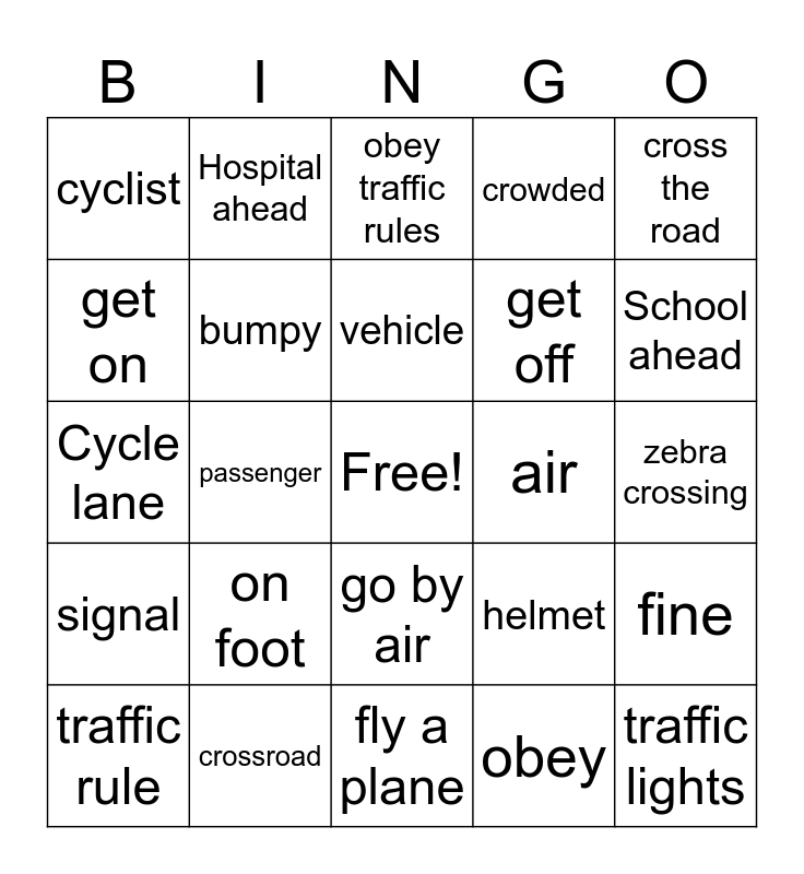 This bingo card has a free space and 44 words: traffic, traffic lights, traffic sign/road sign, traffic rule, traffic jam, obey, obey traffic rules, cross, cross the road, crossroad, crowded, air, go by air, on foot, fly, fly a plane, lane, Cycle lane, ahead, School ahead, Hospital ahead, pavement, pedestrian, cyclist, motorist, zebra crossing, handlebars, roof, helmet, signal, give a signal, fine, park, carry, passenger, fasten, seatbelt, safety, vehicle, get on, get off, narrow, bumpy and distance.