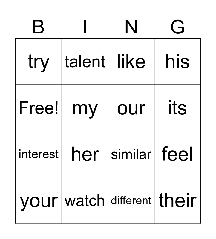 This bingo card has 16 words: watch, feel, like, try, interest, talent, similar, different, Free!, my, your, his, her, its, our and their.