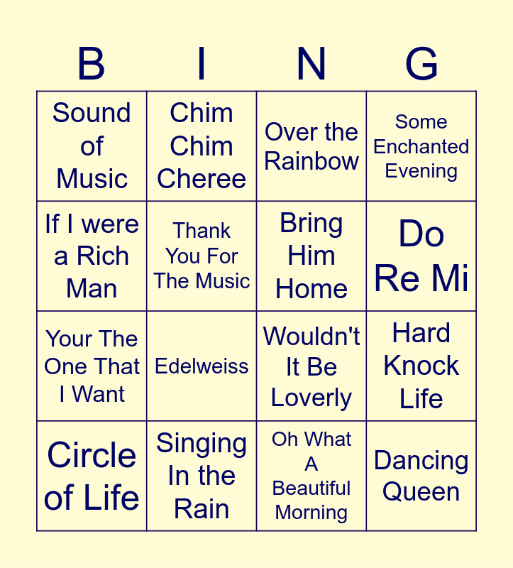 This bingo card has 36 words: All That Jazz, This is Me, Any Dream Will Do, Bring Him Home, Hello Dolly, Dancing Queen, Do Re Mi, I Dreamed A Dream, If I were a Rich Man, Consider Yourself, Hard Knock Life, Some Enchanted Evening, Memory, Singing In the Rain, Edelweiss, Sound of Music, Somewhere, Don't Cry For Me Argentina, Circle of Life, Over the Rainbow, Oh What A Beautiful Morning, Million Dreams, Wash That Man Right Out of My Hair, The Phantom Of The Opera, I could Have Danced All Night, Chim Chim Cheree, Wouldn't It Be Loverly, 76 Trombones, Your The One That I Want, Thank You For The Music, Music Of The Night, Lonely Goatherd, Food Glorious Food, Anything You Can Do, Ol Man River and Mamma Mia.