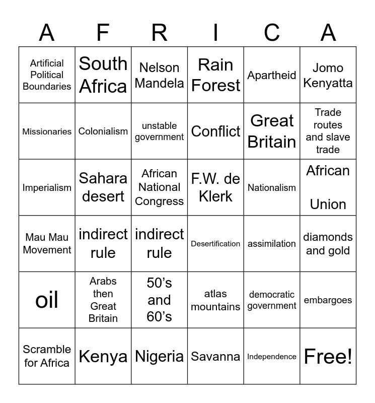 This bingo card has 42 words: Independence, Colonialism, Dutch then Great Britain, Nationalism, diamonds and gold, indirect rule, Imperialism, Berlin Conference, Nelson Mandela, African Union, African National Congress, Conflict, Trade routes and slave trade, Apartheid, Kenya, Mau Mau Movement, embargoes, Great Britain, Free!, South Africa, Jomo Kenyatta, 50’s and 60’s, oil, Artificial Political Boundaries, work together, Scramble for Africa, unstable government, Pan-Africanism, Arabs then Great Britain, democratic government, Partitioning, F.W. de Klerk, Missionaries, assimilation, Nigeria, indirect rule, Desertification, Sahara desert, atlas mountains, Savanna, Rain Forest and Sahel.
