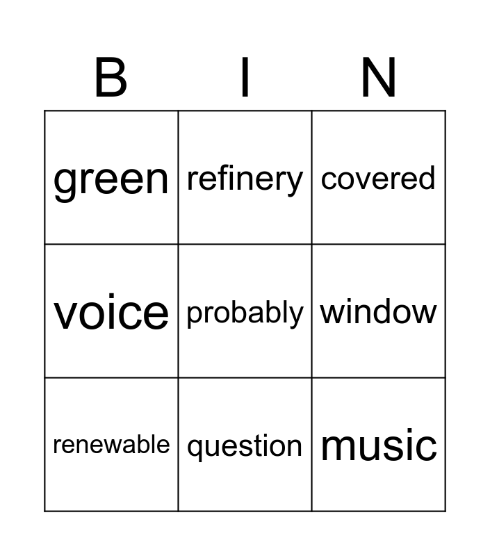 This bingo card has 13 words: Free!, body, renewable, refinery, voice, probably, music, street, question, green, window, covered and passed.