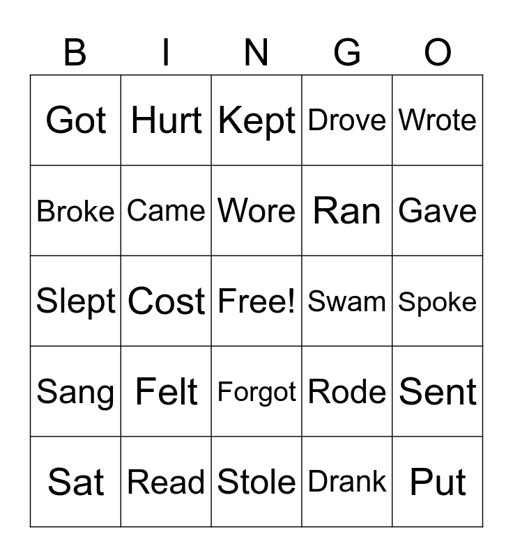 This bingo card has a free space and 26 words: Forgot, Drank, Wore, Read, Wrote, Got, Broke, Hurt, Spoke, Rode, Ran, Slept, Sent, Sat, Cost, Won, Drove, Sang, Kept, Put, Gave, Stole, Swam, Felt, Came and Woke.