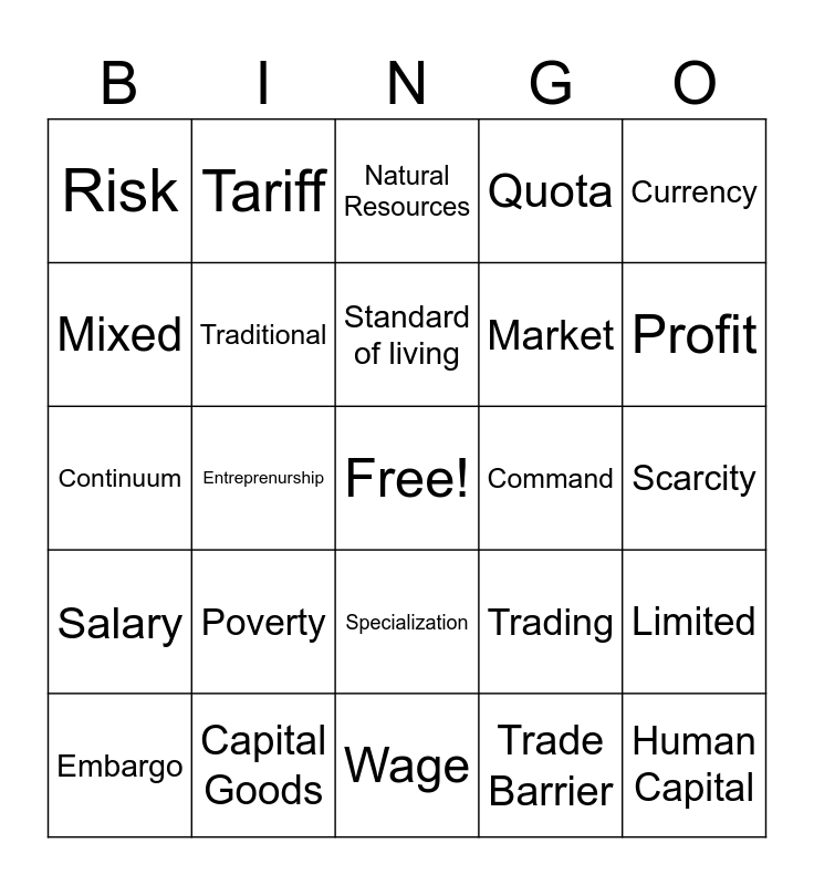 This bingo card has a free space and 24 words: Poverty, Capital Goods, Standard of living, Embargo, Currency, Risk, Mixed, Tariff, Command, Specialization, Market, Continuum, Trading, Limited, Traditional, Trade Barrier, Scarcity, Natural Resources, Profit, Entreprenurship, Human Capital, Salary, Quota and Wage.