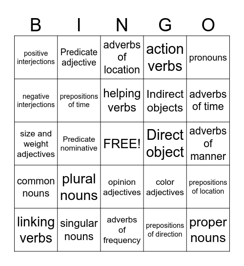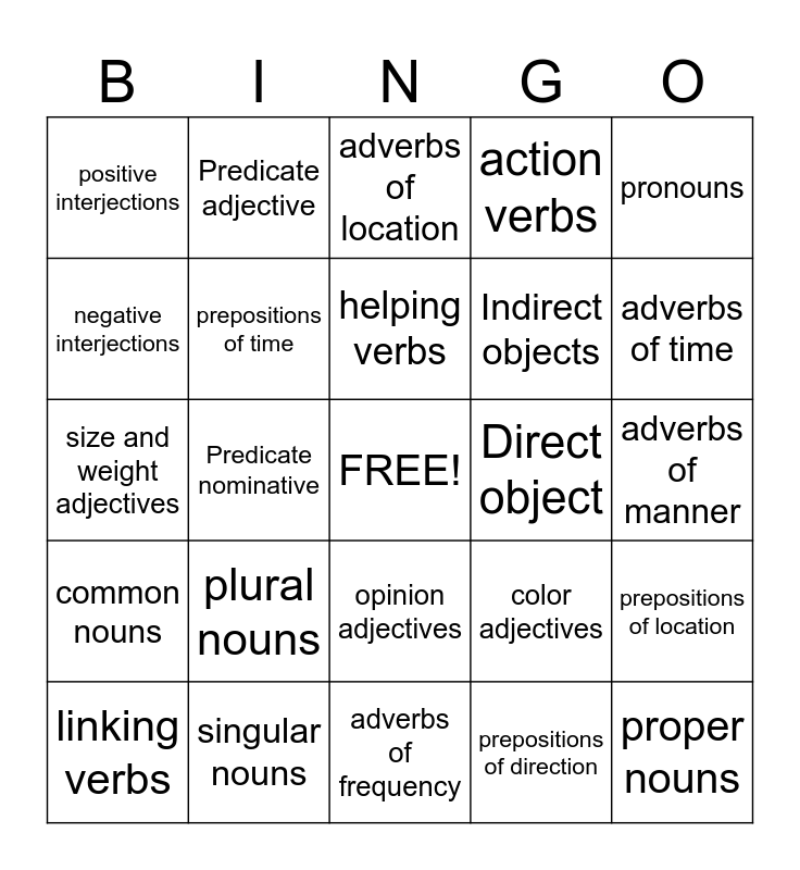 This bingo card has a free space and 24 words: plural nouns, singular nouns, helping verbs, linking verbs, pronouns, positive interjections, negative interjections, Predicate adjective, Direct object, opinion adjectives, Indirect objects, size and weight adjectives, color adjectives, prepositions of location, prepositions of time, prepositions of direction, adverbs of manner, adverbs of location, adverbs of time, Predicate nominative, proper nouns, common nouns, action verbs and adverbs of frequency.