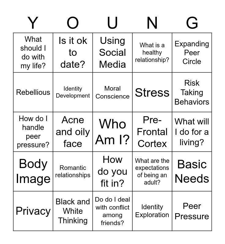 This bingo card has a free space and 24 words: Romantic relationships, Black and White Thinking, Moral Conscience, Privacy, Expanding Peer Circle, What should I do with my life?, Rebellious, Is it ok to date?, Pre-Frontal Cortex, How do you fit in?, Stress, How do I handle peer pressure?, What are the expectations of being an adult?, Basic Needs, Identity Development, Identity Exploration, What will I do for a living?, Using Social Media, Risk Taking Behaviors, Acne and oily face, Peer Pressure, Body Image, What is a healthy relationship? and Do do I deal with conflict among friends?.