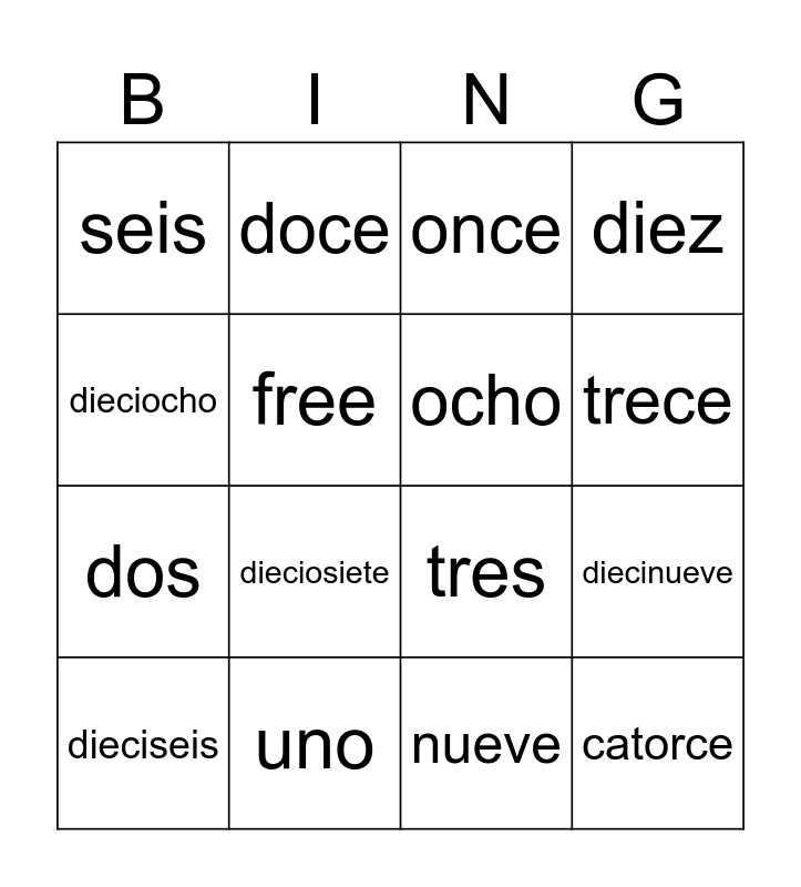 This bingo card has 21 words: uno, siete, doce, cinco, nueve, ocho, seis, once, tres, trece, dos, diez, catorce, quince, free, cuatro, dieciseis, dieciosiete, dieciocho, diecinueve and veinte.