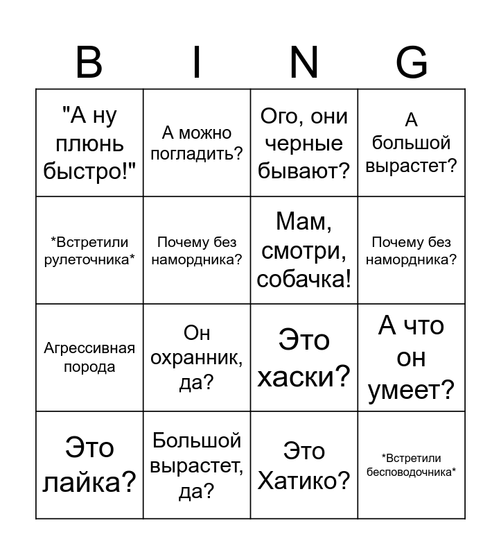 This bingo card has 19 words: Это хаски?, "Нельзя!", Ого, они черные бывают?, *Встретили бесповодочника*, А что он умеет?, *Встретили рулеточника*, Это Хатико?, "А ну плюнь быстро!", А можно погладить?, Агрессивная порода, Он охранник, да?, Почему без намордника?, Мам, смотри, собачка!, Большой вырастет, да?, Это лайка?, Что вы его на поводке мучаете, пусть побегает, А большой вырастет?, Почему без намордника? and Он охранник, да?.