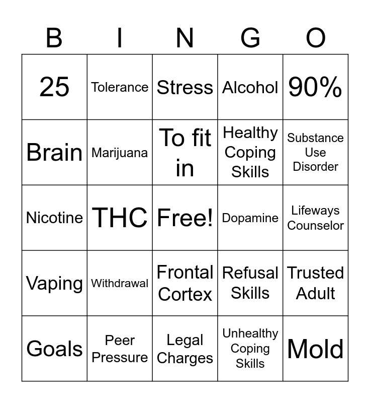 This bingo card has a free space and 24 words: Withdrawal, Peer Pressure, To fit in, Goals, 90%, 25, Brain, Tolerance, Dopamine, Frontal Cortex, Healthy Coping Skills, Nicotine, Refusal Skills, Trusted Adult, Marijuana, Unhealthy Coping Skills, Lifeways Counselor, Stress, Substance Use Disorder, THC, Mold, Vaping, Alcohol and Legal Charges.