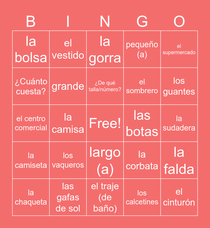 This bingo card has a free space and 35 words: barato (a), caro (a), corto (a), grande, largo (a), pequeño (a), ¿Cuánto cuesta?, ¿De qué color (es)?, ¿De qué talla/número?, el almacén, el centro comercial, el supermercado, la tienda de ropa, el abrigo, la bolsa, las botas, los calcetines, la camisa, la camiseta, el cinturón, la corbata, la chaqueta, la falda, las gafas de sol, la gorra, los guantes, los pantalónes (cortos), las sandalias, el sombrero, la sudadera, el suéter/jersey, el traje (de baño), los vaqueros, el vestido and los zapatos.