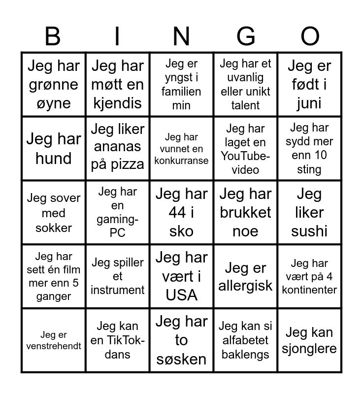 This bingo card has 25 words: Jeg spiller et instrument, Jeg har to søsken, Jeg har vunnet en konkurranse, Jeg er venstrehendt, Jeg er født i juni, Jeg har grønne øyne, Jeg har hund, Jeg har møtt en kjendis, Jeg har brukket noe, Jeg har vært i USA, Jeg har laget en YouTube-video, Jeg sover med sokker, Jeg er allergisk, Jeg har vært på 4 kontinenter, Jeg liker ananas på pizza, Jeg kan sjonglere, Jeg liker sushi, Jeg er yngst i familien min, Jeg har sydd mer enn 10 sting, Jeg har en gaming-PC, Jeg har 44 i sko, Jeg kan en TikTok-dans, Jeg har sett én film mer enn 5 ganger, Jeg har et uvanlig eller unikt talent and Jeg kan si alfabetet baklengs.