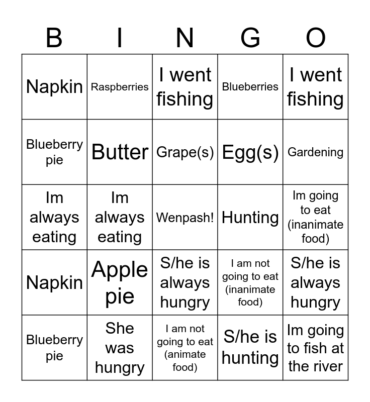 This bingo card has a free space and 150 words: Apple(s), Banana(s), Orange(s), Grape(s), Im eating (animate food), Im eating (inanimate food), That tastes good (animate), That tastes good (inanimate), Im going to eat (anmate food), Im going to eat (inanimate food), Restaurant, Bacon, Egg(s), Potato(es), Butter, Salt, Pepper, Flour, Plate, Bowl, Spoon, Fork, Cucumber(s), Pie(s), Im going to hunt, Deer, Turkey, Hunting, Gardening, Im going to garden, S/he is hunting, Im hungry, S/he’s hungry, Are you hungry?, Is she hungry?, Are you going to eat?, Did you eat?, Im going to hunt in the bush, Im going to fish at the river, Fish(es), Worms, S/he is going fishing, I went fishing, S/he went fishing, Im full, Are you full?, S/he is full, Cup, Napkin, She was hungry, Im always hungry, S/he is always hungry, Im always eating, I like to eat, I like to fish, I like to hunt, Beef, Pork, Chicken(s), Fries, Hotdog, Apple pie, Blueberry pie, Strawberries, Blackberries, Blueberries, Raspberries, Im not hungry anymore, Juice, I am not going to eat (animate food), I am not going to eat (inanimate food), Food, Water, Its half full, Its full, Apple(s), Banana(s), Orange(s), Grape(s), Im eating (animate food), Im eating (inanimate food), That tastes good (animate), That tastes good (inanimate), Im going to eat (anmate food), Im going to eat (inanimate food), Restaurant, Bacon, Egg(s), Potato(es), Butter, Salt, Pepper, Flour, Plate, Bowl, Spoon, Fork, Cucumber(s), Pie(s), Im going to hunt, Deer, Turkey, Hunting, Gardening, Im going to garden, S/he is hunting, Im hungry, S/he’s hungry, Are you hungry?, Is she hungry?, Are you going to eat?, Did you eat?, Im going to hunt in the bush, Im going to fish at the river, Fish(es), Worms, S/he is going fishing, I went fishing, S/he went fishing, Im full, Are you full?, S/he is full, Cup, Napkin, She was hungry, Im always hungry, S/he is always hungry, Im always eating, I like to eat, I like to fish, I like to hunt, Beef, Pork, Chicken(s), Fries, Hotdog, Apple pie, Blueberry pie, Strawberries, Blackberries, Blueberries, Raspberries, Im not hungry anymore, Juice, I am not going to eat (animate food), I am not going to eat (inanimate food), Food, Water, Its half full and Its full.