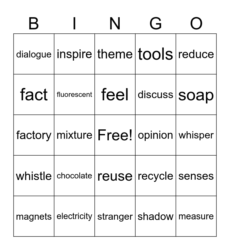 This bingo card has a free space and 24 words: chocolate, electricity, feel, magnets, reduce, dialogue, fact, inspire, opinion, reuse, discuss, factory, recycle, senses, fluorescent, shadow, whisper, theme, soap, mixture, measure, whistle, tools and stranger.