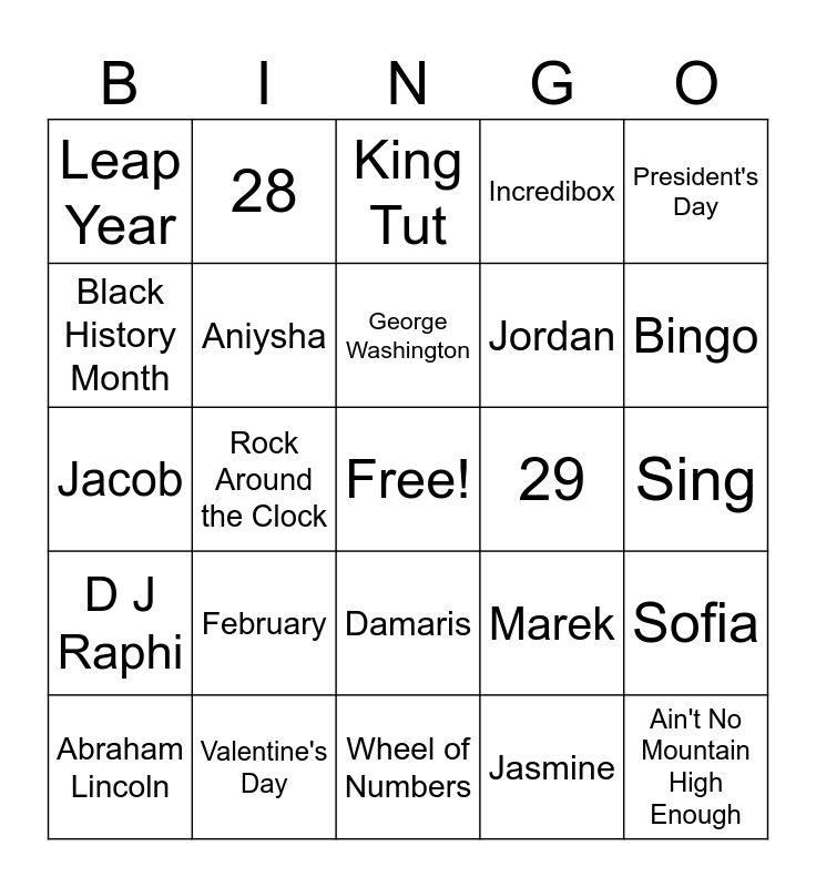 This bingo card has a free space and 24 words: February, Valentine's Day, George Washington, Abraham Lincoln, President's Day, Leap Year, Black History Month, 28, 29, Damaris, Jordan, Jacob, Marek, Sofia, Aniysha, Jasmine, Sing, King Tut, Bingo, Rock Around the Clock, Ain't No Mountain High Enough, D J Raphi, Incredibox and Wheel of Numbers.