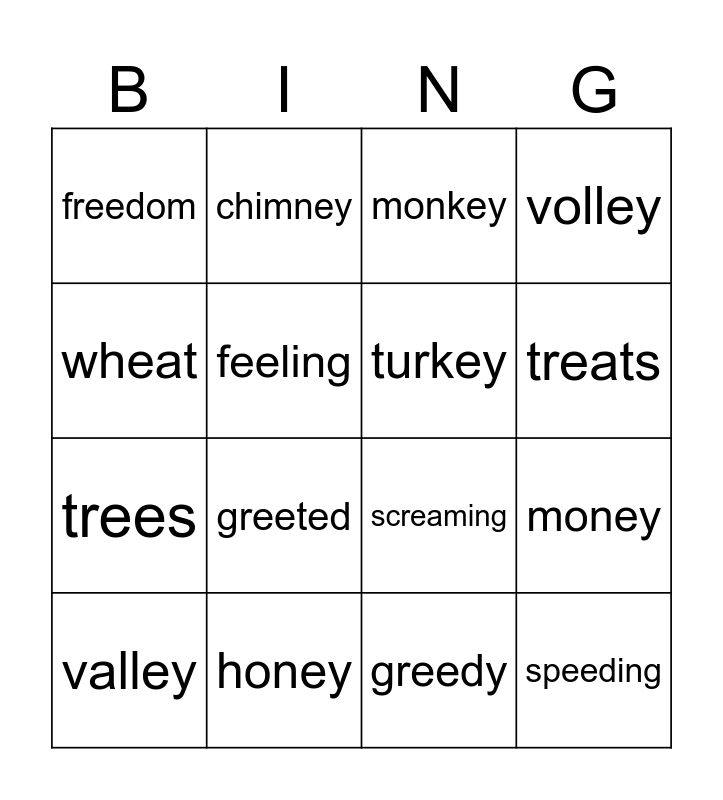 This bingo card has 16 words: honey, money, monkey, freedom, trees, chimney, screaming, greedy, wheat, feeling, valley, volley, greeted, treats, turkey and speeding.