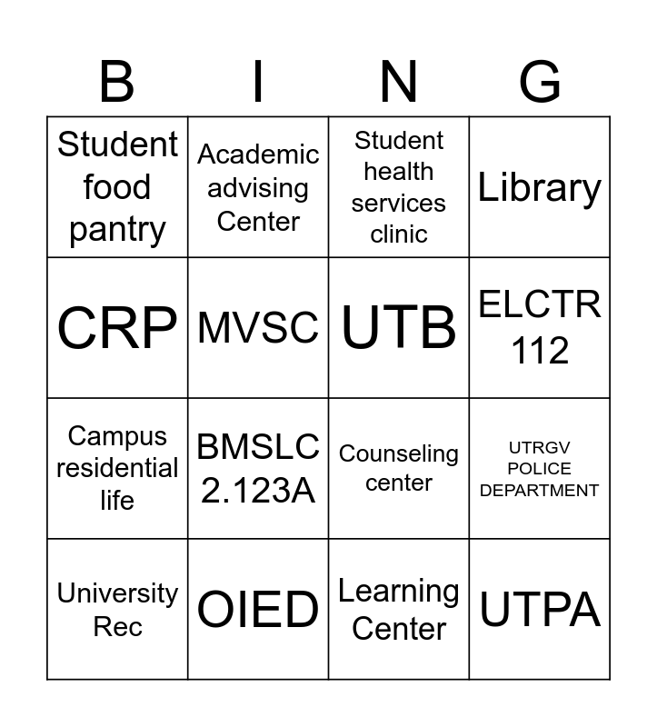 This bingo card has 16 words: OIED, UTRGV POLICE DEPARTMENT, Student health services clinic, Student food pantry, Campus residential life, Academic advising Center, Counseling center, Learning Center, CRP, MVSC, University Rec, Library, BMSLC 2.123A, ELCTR 112, UTB and UTPA.