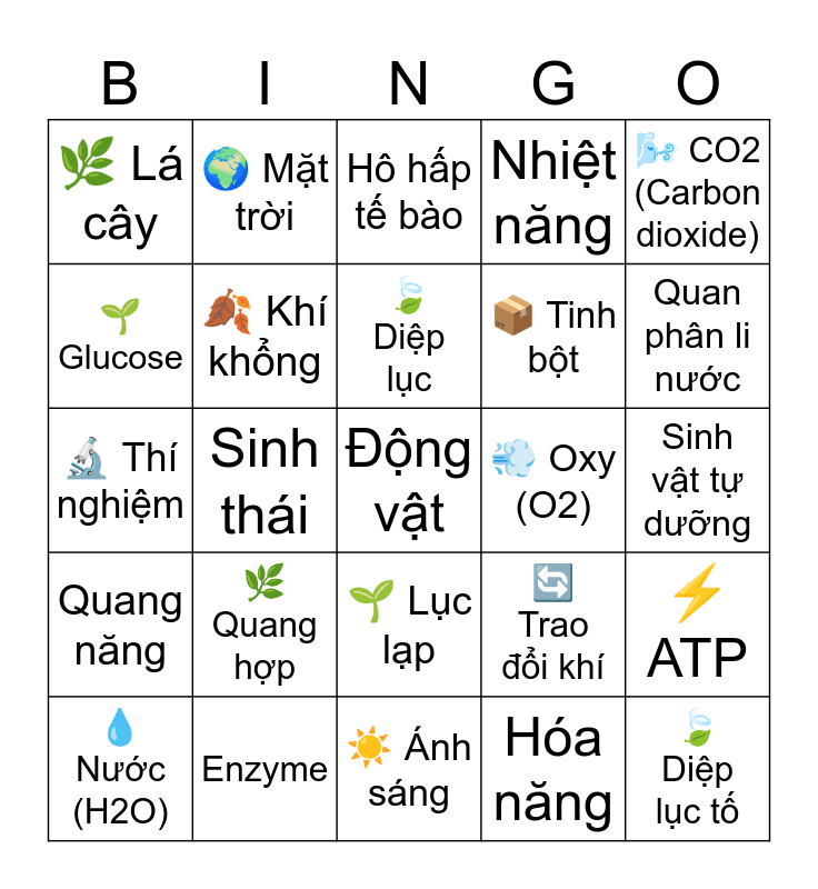 This bingo card has 25 words: 🌿 Quang hợp, ☀️ Ánh sáng, 🍃 Diệp lục, 💧 Nước (H2O), 🌬️ CO2 (Carbon dioxide), 🌿 Lá cây, 🌱 Glucose, 🌍 Mặt trời, 💨 Oxy (O2), 🌱 Lục lạp, 📦 Tinh bột, 🔬 Thí nghiệm, 🔄 Trao đổi khí, ⚡ ATP, 🍂 Khí khổng, 🍃 Diệp lục tố, Sinh vật tự dưỡng, Hô hấp tế bào, Quan phân li nước, Sinh thái, Động vật, Enzyme, Quang năng, Nhiệt năng and Hóa năng.