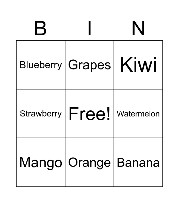 This bingo card has a free space and 11 words: Apple, Orange, Banana, Mango, Grapes, Kiwi, Watermelon, Dragon Fruit, Strawberry, Blueberry and Raspberry.