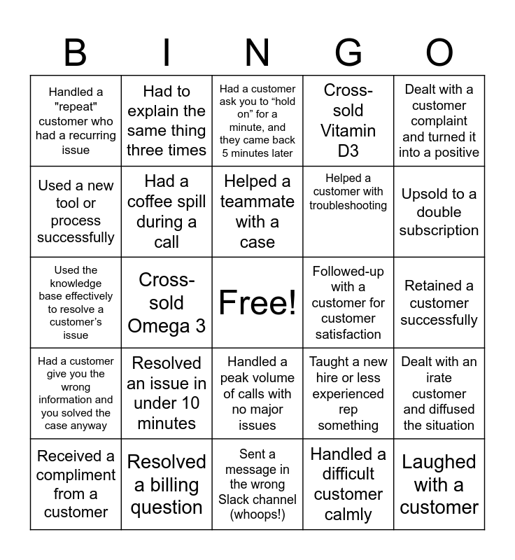 This bingo card has a free space and 24 words: Resolved an issue in under 10 minutes, Resolved a billing question, Helped a teammate with a case, Received a compliment from a customer, Dealt with a customer complaint and turned it into a positive, Handled a "repeat" customer who had a recurring issue, Used a new tool or process successfully, Had to explain the same thing three times, Followed-up with a customer for customer satisfaction, Handled a peak volume of calls with no major issues, Helped a customer with troubleshooting, Used the knowledge base effectively to resolve a customer’s issue, Taught a new hire or less experienced rep something, Dealt with an irate customer and diffused the situation, Had a coffee spill during a call, Handled a difficult customer calmly, Retained a customer successfully, Had a customer ask you to “hold on” for a minute, and they came back 5 minutes later, Upsold to a double subscription, Cross-sold Omega 3, Laughed with a customer, Had a customer give you the wrong information and you solved the case anyway, Cross-sold Vitamin D3 and Sent a message in the wrong Slack channel (whoops!).