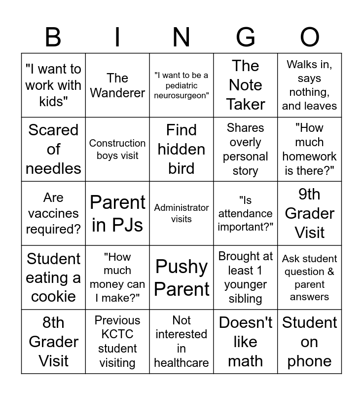 This bingo card has a free space and 29 words: 8th Grader Visit, Parent without child, Parent in PJs, Student in PJs, "I want to work with kids", "I want to be a pediatric neurosurgeon", Construction boys visit, "How much money can I make?", "Is attendance important?", Previous KCTC student visiting, 9th Grader Visit, Student on phone, Not interested in healthcare, Doesn't like math, "How much homework is there?", "Is this class a lot of work?", Pushy Parent, Student eating a cookie, Walks in, says nothing, and leaves, Are vaccines required?, Brought at least 1 younger sibling, Asks for medical advice, Shares overly personal story, Scared of needles, The Note Taker, The Wanderer, Ask student question & parent answers, Find hidden bird and Student Handshake.