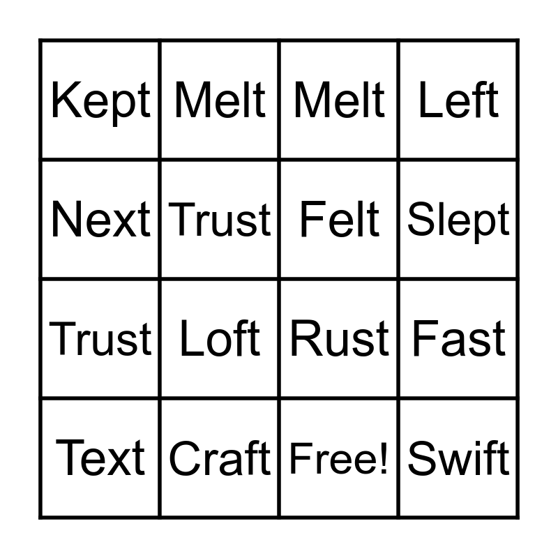 This bingo card has 17 words: Free!, Text, Melt, Kept, Loft, Left, Fast, Felt, Slept, Trust, Craft, Rust, Next, Melt, Trust, Craft and Swift.