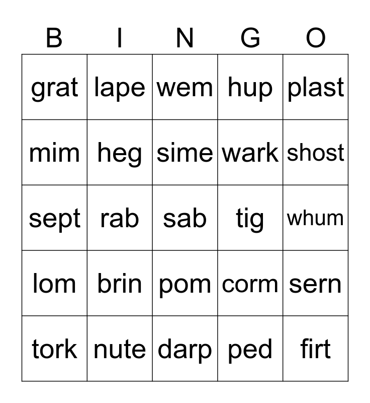 This bingo card has 35 words: nar, seb, lor, heg, pom, hup, mim, nerm, sime, lart, sept, plast, vit, thog, grat, tig, ped, rab, lom, sab, corm, tork, sern, nute, wem, shost, firt, farn, wark, whum, vad, darp, brin, lape and fip.
