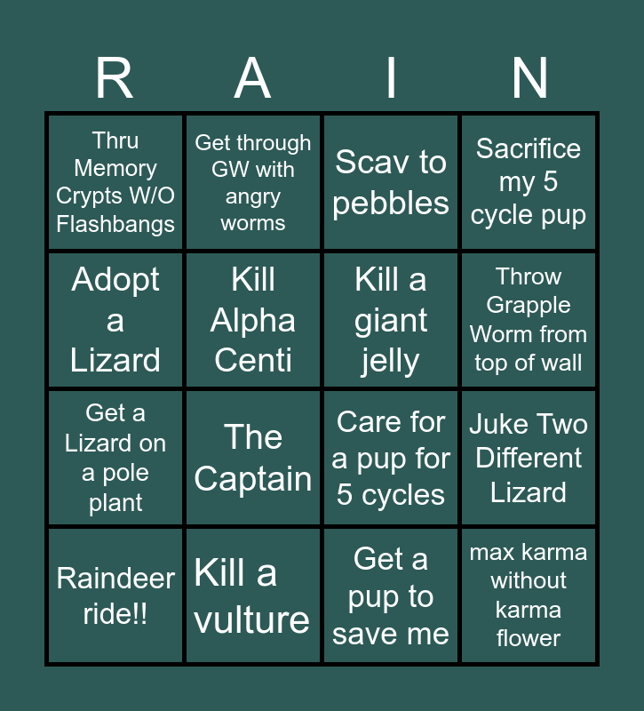 This bingo card has 16 words: Kill a vulture, Juke Two Different Lizard, Scav to pebbles, Thru Memory Crypts W/O Flashbangs, Get a Lizard on a pole plant, Get through GW with angry worms, Care for a pup for 5 cycles, Get a pup to save me, Adopt a Lizard, Kill Alpha Centi, Raindeer ride!!, Sacrifice my 5 cycle pup, The Captain, Throw Grapple Worm from top of wall, Kill a giant jelly and max karma without karma flower.