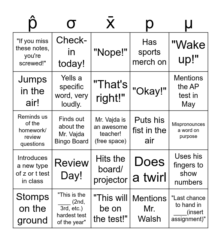 This bingo card has a free space and 24 words: Review Day!, "This is the ____ (2nd, 3rd, etc.) hardest test of the year", "That's right!", Stomps on the ground, "Wake up!", "If you miss these notes, you're screwed!", Jumps in the air!, Check-in today!, Puts his fist in the air, Hits the board/ projector, "Okay!", Reminds us of the homework/ review questions, Does a twirl, Uses his fingers to show numbers, Yells a specific word, very loudly., Mentions Mr. Walsh, Mispronounces a word on purpose, "Nope!", Mentions the AP test in May, Finds out about the Mr. Vajda Bingo Board, "Last chance to hand in ____(insert assignment)", Introduces a new type of z or t test in class, Has sports merch on and "This will be on the test!".
