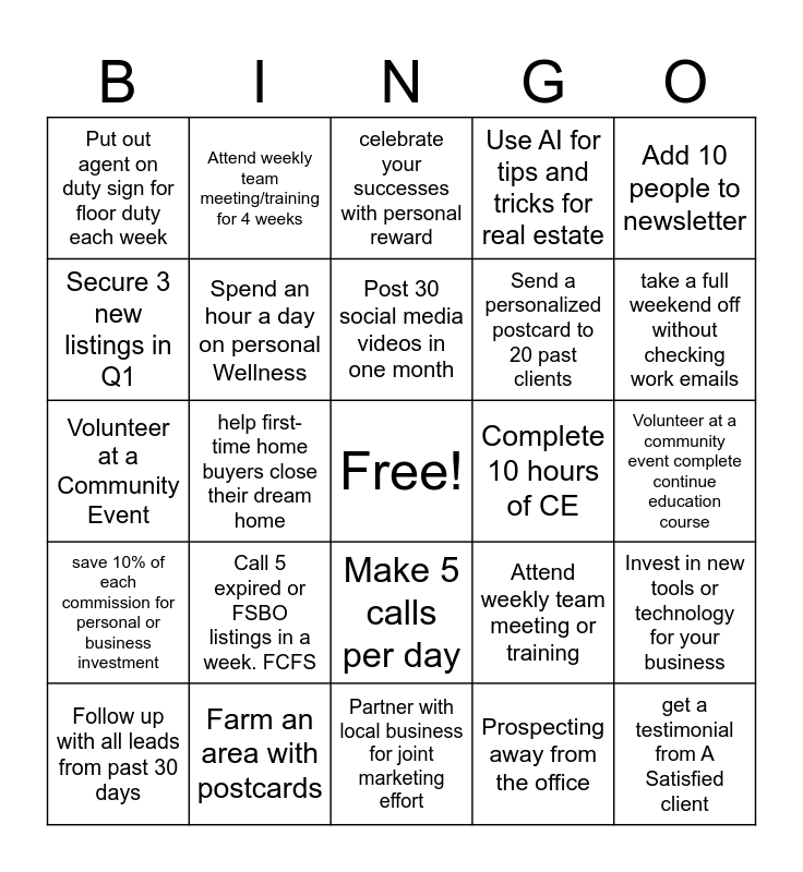 This bingo card has a free space and 24 words: Call 5 expired or FSBO listings in a week. FCFS, Farm an area with postcards, Post 30 social media videos in one month, Follow up with all leads from past 30 days, Add 10 people to newsletter, Put out agent on duty sign for floor duty each week, Secure 3 new listings in Q1, Attend weekly team meeting/training for 4 weeks, Complete 10 hours of CE, Make 5 calls per day, Send a personalized postcard to 20 past clients, Volunteer at a Community Event, Attend weekly team meeting or training, Invest in new tools or technology for your business, Spend an hour a day on personal Wellness, Prospecting away from the office, Volunteer at a community event complete continue education course, celebrate your successes with personal reward, take a full weekend off without checking work emails, help first-time home buyers close their dream home, get a testimonial from A Satisfied client, save 10% of each commission for personal or business investment, Use AI for tips and tricks for real estate and Partner with local business for joint marketing effort.