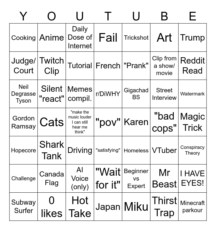 This bingo card has a free space and 48 words: Beginner vs Expert, Clip from a show/ movie, Japan, Cats, Memes compil., Magic Trick, Anime, 0 likes, Art, "satisfying", Trump, Fail, Street Interview, Gigachad BS, Challenge, "bad cops", Judge/ Court, Reddit Read, Mr Beast, Trickshot, "Prank", "make the music louder I can still hear me think", Cooking, Twitch Clip, I HAVE EYES!, Tutorial, Watermark, Subway Surfer, r/DiWHY, Silent "react", Thirst Trap, Karen, Conspiracy Theory, Canada Flag, Gordon Ramsay, Homeless, VTuber, Neil Degrasse Tyson, Driving, AI Voice (only), Hopecore, Minecraft parkour, Daily Dose of Internet, Hot Take, French, "Wait for it", Shark Tank and Miku.