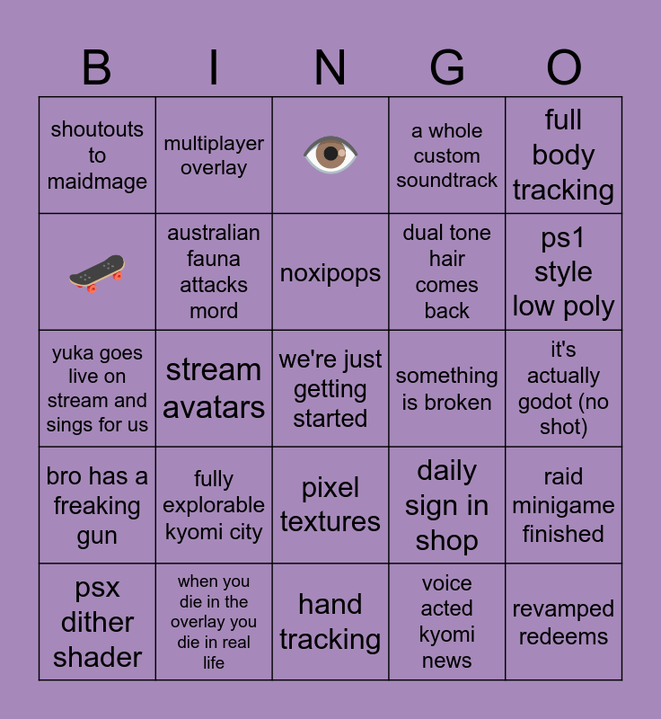 This bingo card has a free space and 24 words: fully explorable kyomi city, when you die in the overlay you die in real life, noxipops, psx dither shader, full body tracking, shoutouts to maidmage, 🛹, multiplayer overlay, something is broken, pixel textures, dual tone hair comes back, yuka goes live on stream and sings for us, daily sign in shop, raid minigame finished, australian fauna attacks mord, voice acted kyomi news, it's actually godot (no shot), 👁️, ps1 style low poly, stream avatars, revamped redeems, bro has a freaking gun, a whole custom soundtrack and hand tracking.