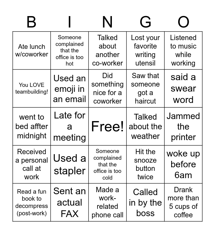 This bingo card has a free space and 27 words: Hit the snooze button twice, Went to the gym/worked out (outside of work), Saw that someone got a haircut, Made a work-related phone call, You LOVE teambuilding!, Talked about another co-worker, Someone complained that the office is too hot, Received a personal call at work, Talked about the weather, woke up before 6am, went to bed affter midnight, Lost your favorite writing utensil, Read a fun book to decompress (post-work), Sent an actual FAX, said a swear word, Cursed someone while on mute, Used an emoji in an email, Did something nice for a coworker, Used a stapler, Ate lunch w/coworker, Jammed the printer, Called in by the boss, Late for a meeting, Drank more than 5 cups of coffee, Someone complained that the office is too cold, Listened to music while working and Watched a show/ movie on your phone.
