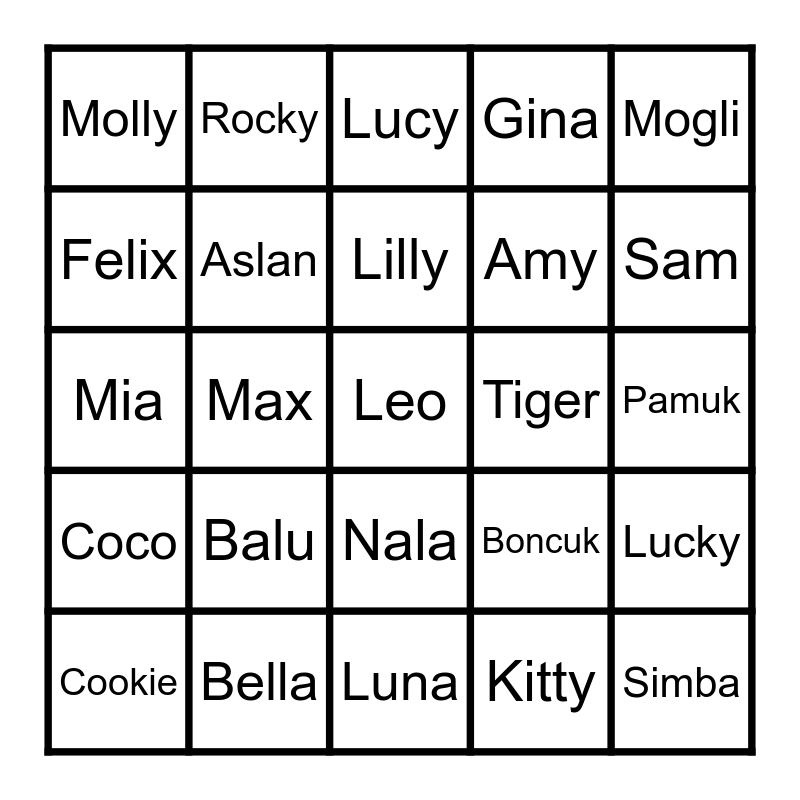 This bingo card has 25 words: Balu, Luna, Lilly, Cookie, Mogli, Molly, Felix, Rocky, Tiger, Nala, Amy, Mia, Boncuk, Lucky, Aslan, Simba, Pamuk, Lucy, Sam, Max, Leo, Bella, Coco, Gina and Kitty.