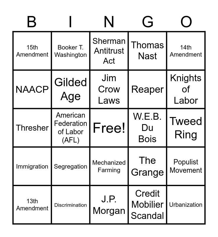This bingo card has a free space and 24 words: Segregation, Discrimination, Jim Crow Laws, 13th Amendment, 14th Amendment, 15th Amendment, NAACP, Booker T. Washington, W.E.B. Du Bois, Mechanized Farming, Reaper, Thresher, The Grange, Populist Movement, Gilded Age, Credit Mobilier Scandal, Tweed Ring, Sherman Antitrust Act, Knights of Labor, American Federation of Labor (AFL), Urbanization, Immigration, Thomas Nast and J.P. Morgan.