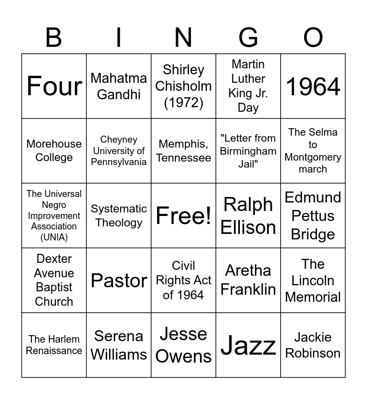 This bingo card has a free space and 64 words: Atlanta, Georgia, "I Have a Dream", 1963, The Lincoln Memorial, Southern Christian Leadership Conference (SCLC), Montgomery Bus Boycott, Mahatma Gandhi, 1968, Memphis, Tennessee, Lorraine Motel, Civil Rights Act of 1964, Selma to Montgomery March, Edmund Pettus Bridge, 1964, 35, Morehouse College, Systematic Theology, Four, "Mine Eyes Have Seen the Glory of the Coming of the Lord", "Letter from Birmingham Jail", Pastor, Dexter Avenue Baptist Church, Martin Luther King Jr. Day, January, 1863, Brown v. Board of Education, March on Washington, Juneteenth (June 19, 1865), Civil Rights Act of 1964, 1865, Voting Rights Act of 1965, Loving v. Virginia, The March on Washington for Jobs and Freedom, The 1968 Riots, The Selma to Montgomery march, The Harlem Renaissance, Howard University, Jazz, Gwendolyn Brooks, Cheyney University of Pennsylvania, The Universal Negro Improvement Association (UNIA), Ralph Ellison, W.E.B. Du Bois, Chadwick Boseman, NAACP (National Association for the Advancement of Colored People), Jackie Robinson, Serena Williams, Chadwick Boseman, Aretha Franklin, Halle Berry, Muhammad Ali, Paul Robeson, Jesse Owens, Marvin Gaye, Jacob Lawrence, Barack Obama, Shirley Chisholm (1972), 1865 (13th Amendment), Juneteenth, Katherine Johnson, Oprah Winfrey, Jesse Owens, George Washington Carver and 1964.