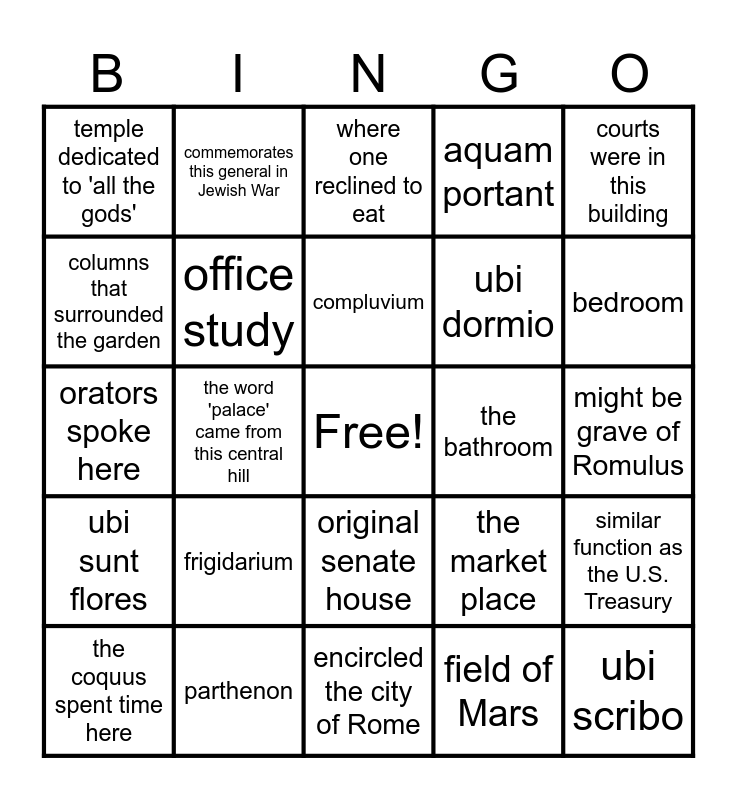 This bingo card has a free space and 24 words: frigidarium, parthenon, compluvium, the coquus spent time here, courts were in this building, temple dedicated to 'all the gods', columns that surrounded the garden, commemorates this general in Jewish War, the bathroom, original senate house, ubi dormio, orators spoke here, the market place, similar function as the U.S. Treasury, office study, field of Mars, might be grave of Romulus, where one reclined to eat, bedroom, the word 'palace' came from this central hill, ubi scribo, ubi sunt flores, aquam portant and encircled the city of Rome.