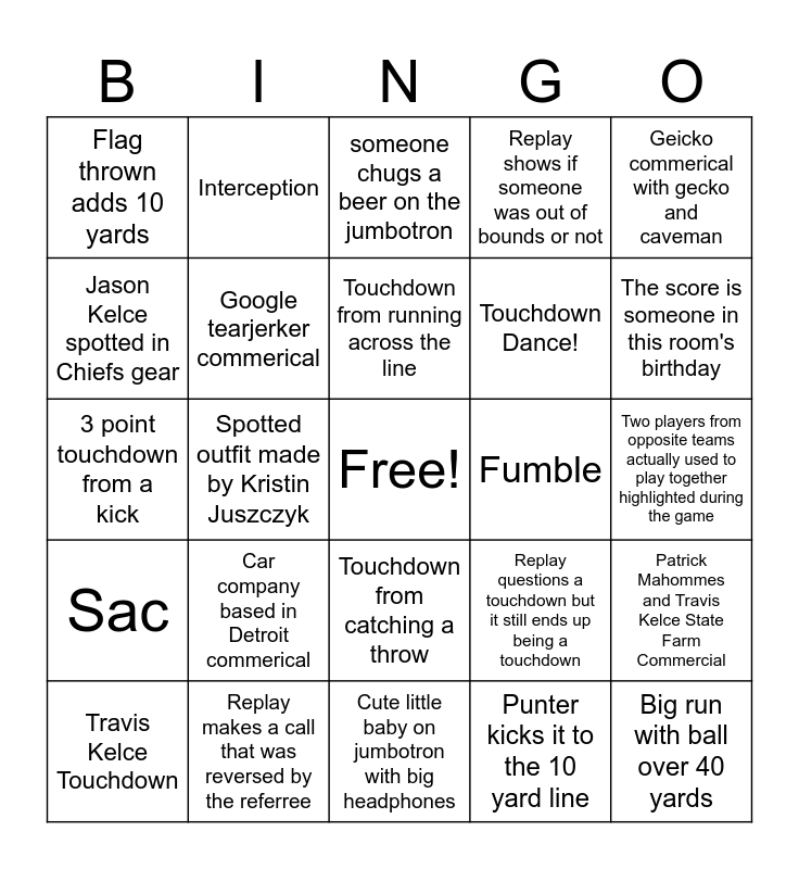 This bingo card has a free space and 28 words: Patrick Mahommes and Travis Kelce State Farm Commercial, Taylor Swift spotted, Touchdown Dance!, Punter kicks it to the 10 yard line, Jason Kelce spotted in Chiefs gear, someone chugs a beer on the jumbotron, Interception, Sac, Fumble, Travis Kelce Touchdown, 3 point touchdown from a kick, Replay shows if someone was out of bounds or not, Replay makes a call that was reversed by the referree, Cute little baby on jumbotron with big headphones, The score is someone in this room's birthday, Turbo Tax commerical, Car company based in Detroit commerical, Google tearjerker commerical, Touchdown from running across the line, Touchdown from catching a throw, Flag thrown adds 10 yards, Big throw and catch over 25 yards, Big run with ball over 40 yards, Spotted outfit made by Kristin Juszczyk, Two players from opposite teams actually used to play together highlighted during the game, Replay questions a touchdown but it still ends up being a touchdown, Geicko commerical with gecko and caveman and Mama Kelce spotted.