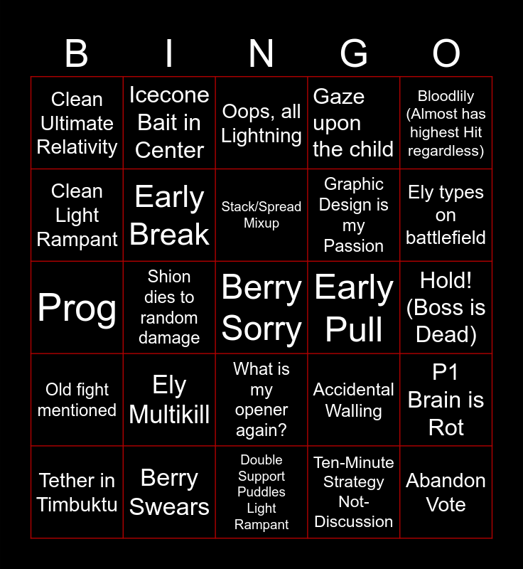 This bingo card has a free space and 24 words: Ely Multikill, Berry Swears, Stack/Spread Mixup, Tether in Timbuktu, Bloodlily (Almost has highest Hit regardless), Clean Ultimate Relativity, Clean Light Rampant, Icecone Bait in Center, Early Pull, What is my opener again?, Graphic Design is my Passion, Prog, Accidental Walling, P1 Brain is Rot, Early Break, Ten-Minute Strategy Not-Discussion, Hold! (Boss is Dead), Oops, all Lightning, Ely types on battlefield, Shion dies to random damage, Abandon Vote, Old fight mentioned, Gaze upon the child and Double Support Puddles Light Rampant.
