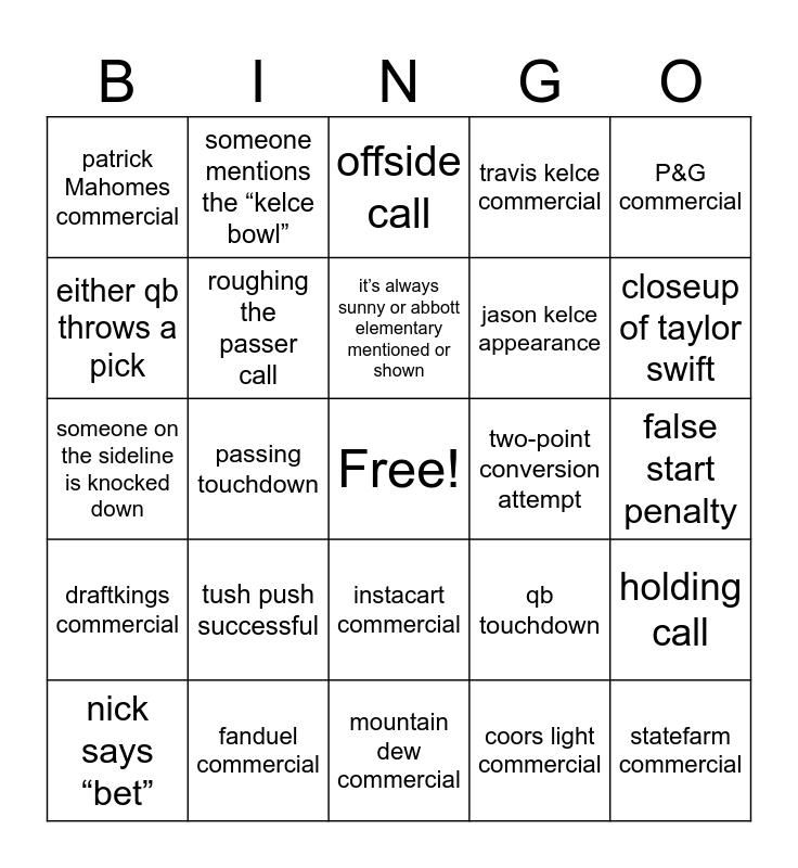 This bingo card has a free space and 60 words: budweiser/ budlight commercial, fanduel commercial, doritos commercial, draftkings commercial, coors light commercial, punt return touchdown, roughing the passer call, unsportsmanlike conduct call, jason kelce appearance, either team fumbles, travis kelce commercial, CBS mentions or shows SpongeBob, either qb throws a pick, missed field goal, jalen hurts commercial, patrick Mahomes commercial, statefarm commercial, P&G commercial, qb sacked, it’s always sunny or abbott elementary mentioned or shown, two-point conversion attempt, offside call, nick says “bet”, holding call, chevy commercial, chiefs touchdown, eagles touchdown, jake elliot makes a field goal, closeup of taylor swift, surprise halftime show appearance, uber eats commercial, temu commercial, pass interference call, someone says “3-peat”, someone mentions the “kelce bowl”, kick or punt block, orion says “bro”, passing touchdown, rushing touchdown, someone on the sideline is knocked down, movie trailer commercial, tush push successful, false start penalty, doordash commercial, qb touchdown, either team goes for it on 4th down, either team challenges a call, call reversed, reese’s commercial, instacart commercial, mountain dew commercial, stella commercial, taco bell commercial, donna kelce appearance, tubi commercial, little ceasars commercial, dove commercial, jalen hurts touchdown, travis kelce touchdown and saquen barkley touchdown.